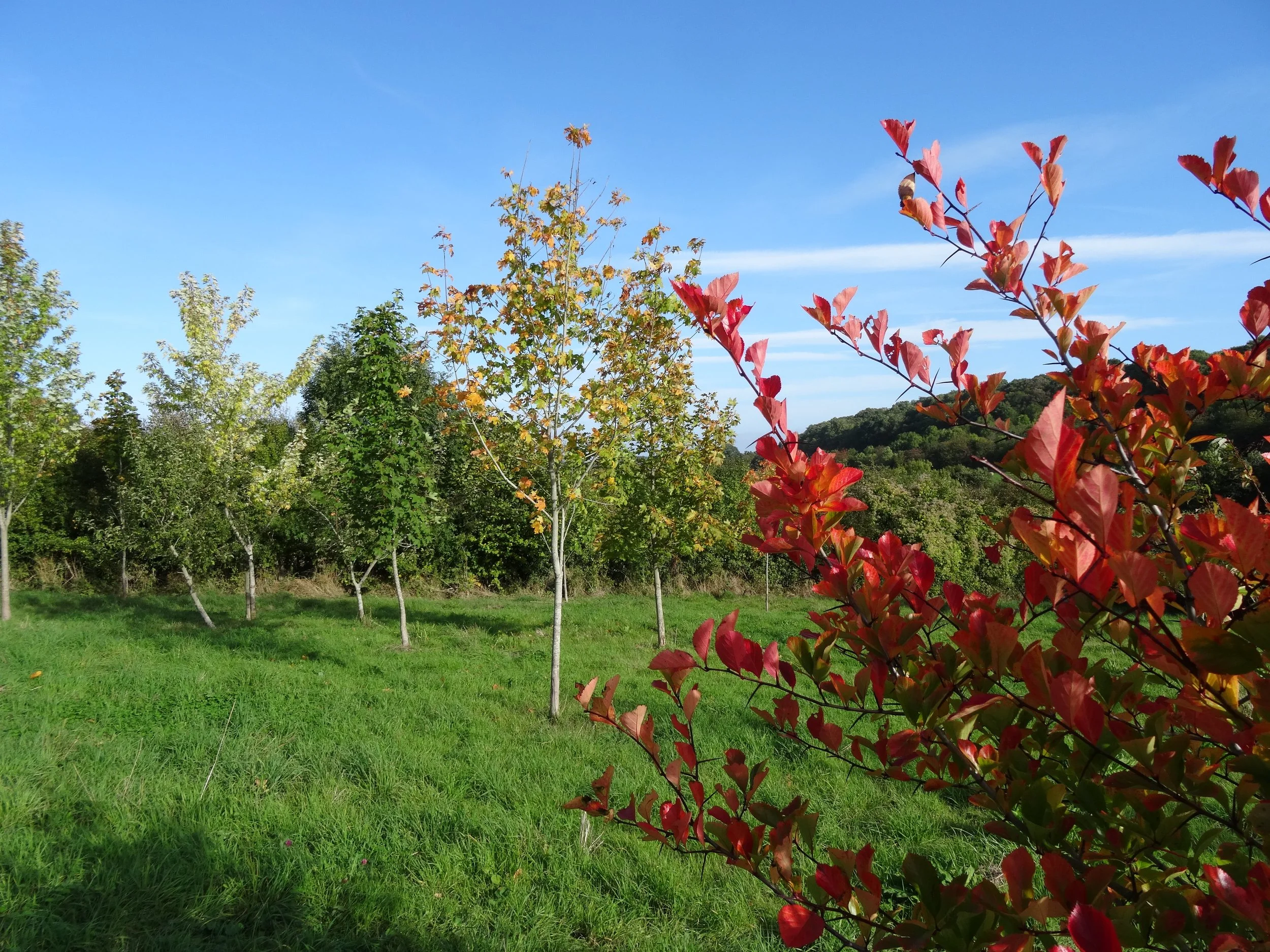 The meadow and orchards are accessed from the resin-bound gravel parking area and from the terrace, itself accessed by seven steps from the paving surrounding the house, or from the meadow. The meadow slopes moderately from the house to the orchards. The meadow surface is not even and there are holes in places, where small animals have made their homes, as well as molehills. Depending on the time of the year and when it has been cut, the meadow will either be covered in relatively short grass or grass and wild flowers, including thistles, up to about 1m high. We keep the orchard grass cut shorter but there are occasional brambles and tree stumps of various sizes there as well as holes made by animals and more mole hills.