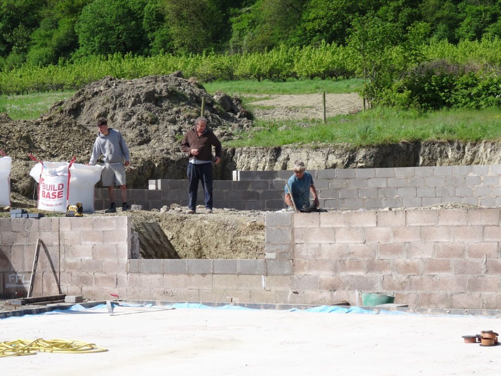 The need for a slope for the digger led, serendipitously, to a simpler patio design with no need for steps at the back and, consequently, to a much better landscaping outcome with a smoother gradation of the land from the house up the valley side. We also amended the position and size of the opening in the ‘horseshoe’ retaining wall where the patio steps would go, as shown by the different building blocks in the original wall