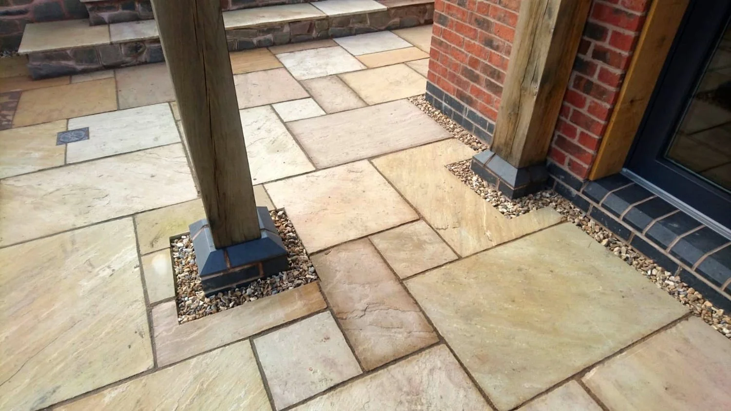 The edges of the patio and the paved area surrounding the house have gravel covering drainage pipes beneath, (see picture, left). The grout between the paving slabs is porous. Even in even heavy rain, there is no pooling of water — the surface just looks wet — and the water is taken into the crushed stone beneath and thence — slowly — to the fin drain