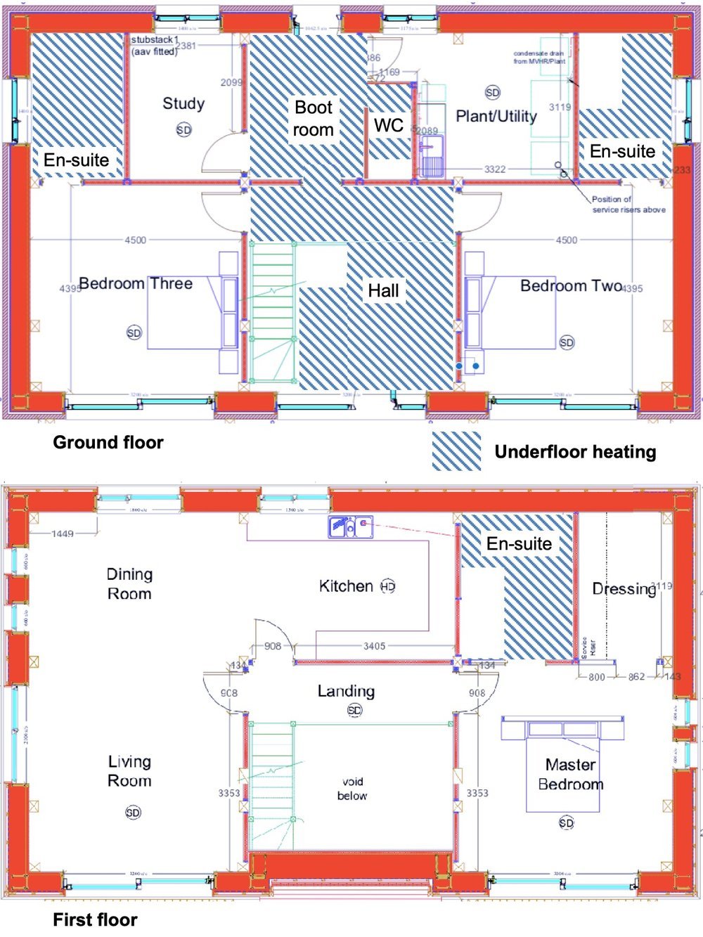 The Passivhaus standard does not specify what the heating system should be. We chose to install a ground source heat pump for domestic hot water and (minimal) space heating with underfloor heating pipes. As indicated in the diagrams, below left, these pipes cover only 25% of the house’s floor area and are fully able to provide that extra little bit of heat to keep the indoor temperature up when the sun has been hidden behind clouds for a few consecutive days. (We estimate that, at January 2024 electricity prices, we spend £129 heating our house. Annually. See the section entitled Passive houses have minute bills for heating and cooling in another post.)