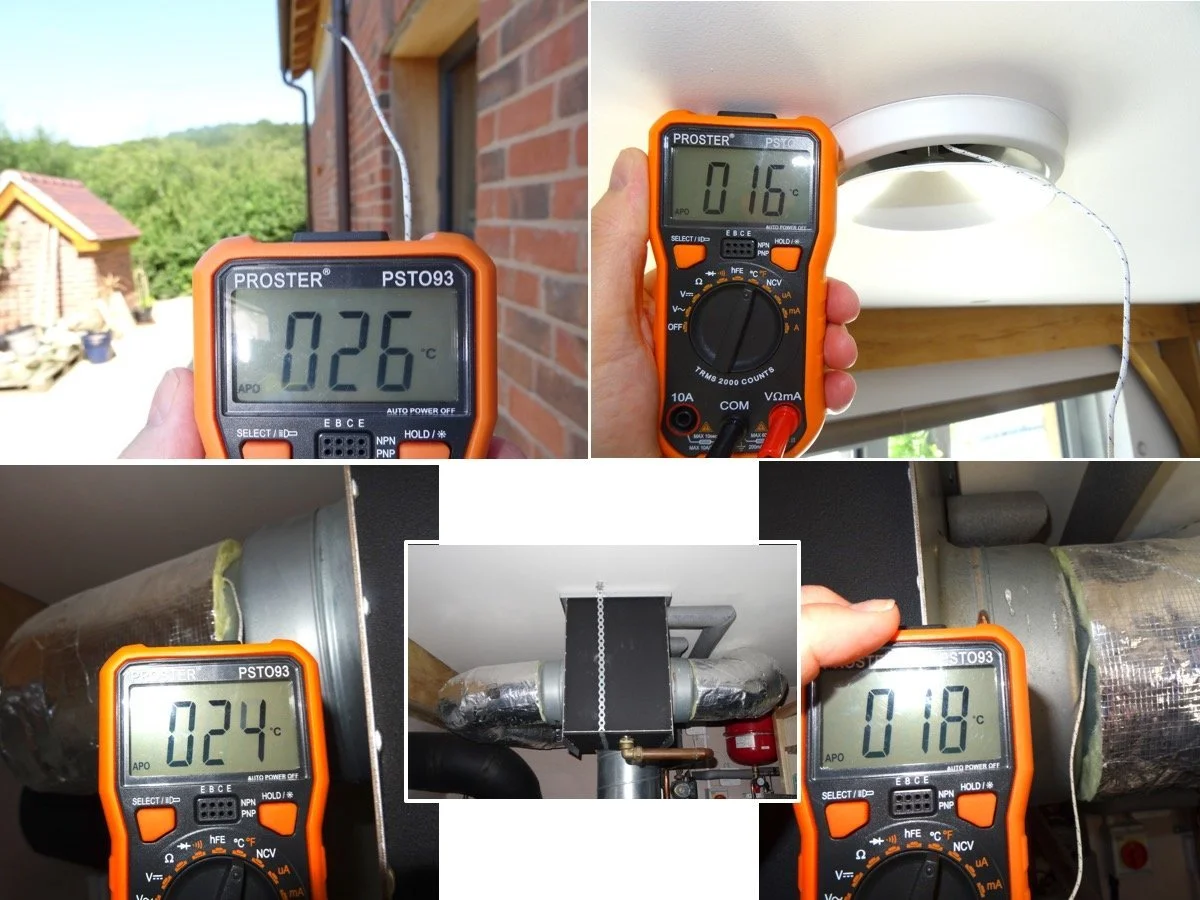 The picture below shows the effect of the cooler battery, which itself can be seen inset bottom centre. The top left image shows that the outdoor temperature was 26°C but the air coming out of the ventilation duct in one of the rooms was just 16°C. Both of these were measured using a thermocouple; outdoors this was in still air and shade, but at the ventilation duct it was in the path of the airflow, which might have reduced its temperature reading slightly. The bottom two images show the temperatures on the outside of the air duct before and after air flowed through the cooler battery. This was measured by tucking the thermocouple under the duct’s insulation. This wouldn’t have measured the exact temperature of the air flowing within the duct but does indicate that the cooler battery extracted some 6°C from the air coming into the house (probably more, as indicated in the upper two images). All of these temperature readings were taken within a few minutes of each other.
