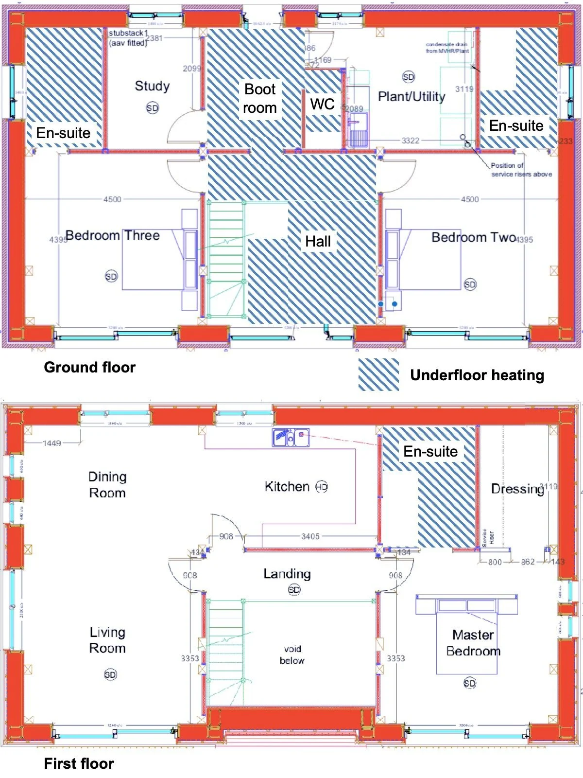 The floor plans on the right show where our underfloor heating pipes are laid. They cover only some 25% of the treated floor area. (The ‘treated floor area’ is the usable internal floor space within the thermal envelope and excludes internal walls, doors, stairs and other ‘unusable’ spaces.)