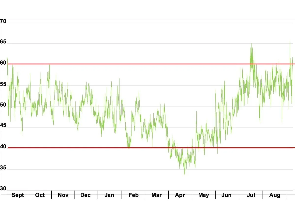 Indoor relative humidity (%) 10 September 2020 to 9 September 2021 (measured at half-hourly intervals by the indoor data logger)