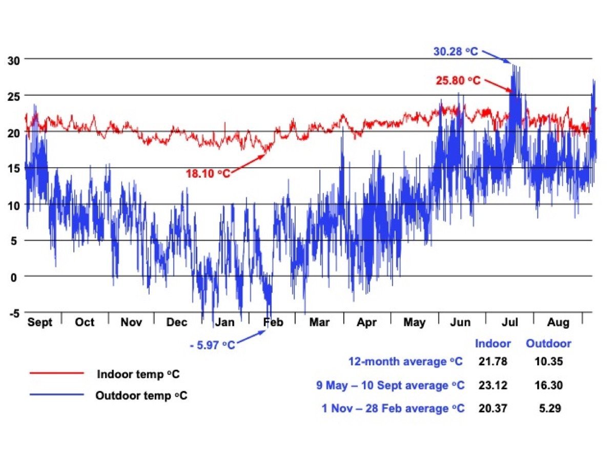 The diagram below shows the Indoor and outdoor temperatures in our house between 10 September 2020 and 9 September 2021. They were measured using high-accuracy data loggers which recorded every 30 minutes.