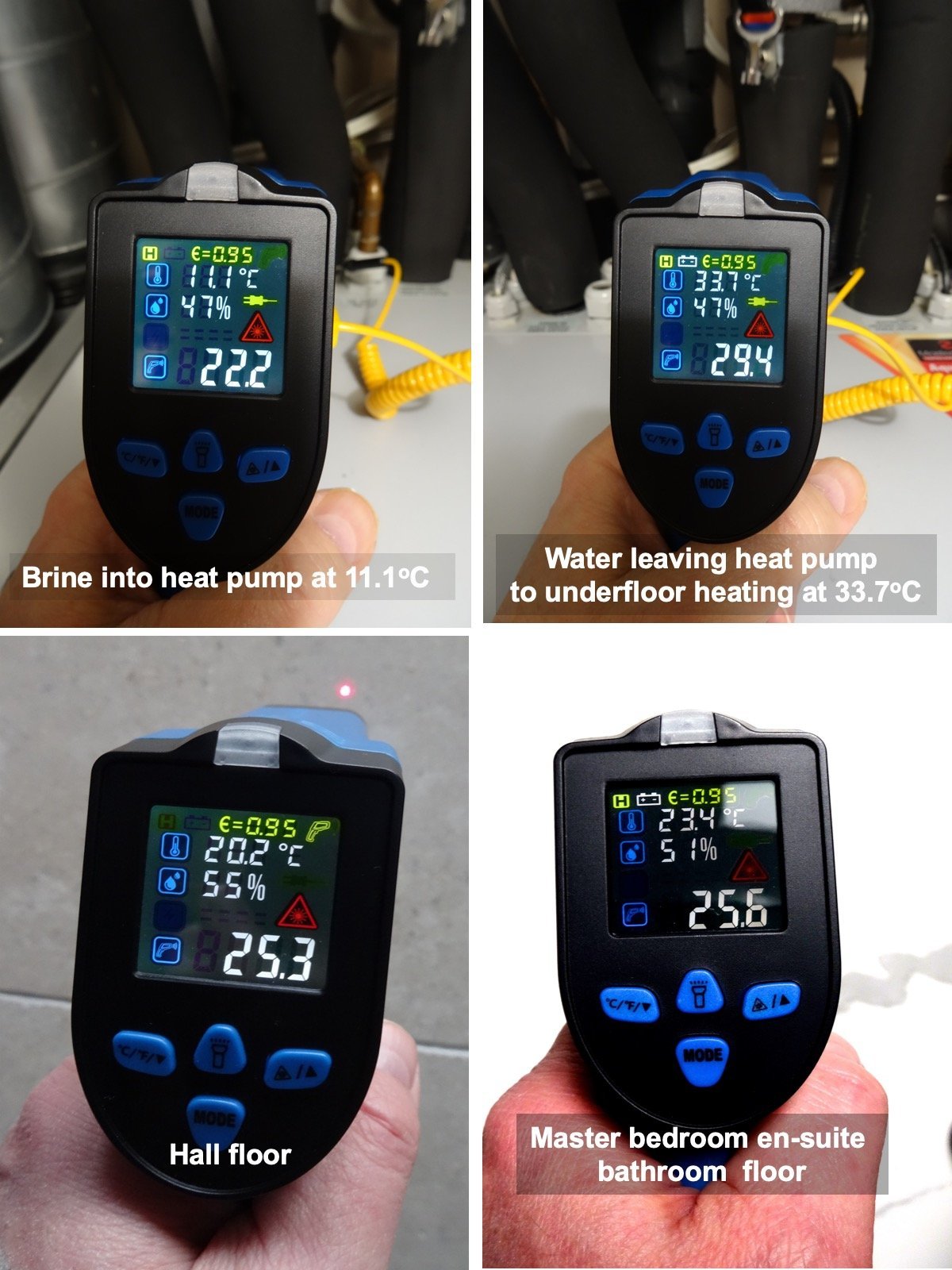 The bottom two pictures show the temperature of the floor tiles in the hall and in the master bedroom ensuite bathroom (20.2ºC and 23.4ºC, respectively) when the heating was on, measured using an infrared surface temperature detector.