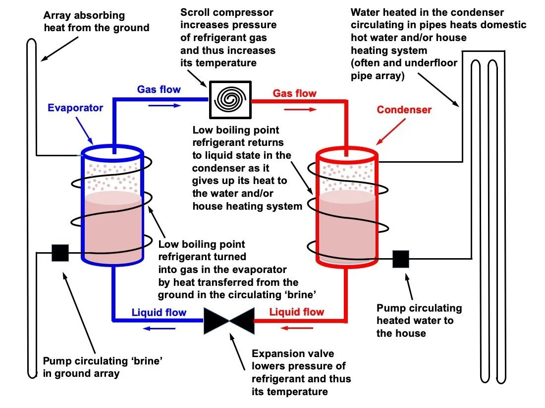 A ground source heat pump has a long ‘collector’ pipe in the ground (there are various configurations for these ground arrays, including deep boreholes). This heat collector contains a mixture of water and an antifreeze which is commonly called ‘brine’. Because the brine circulating in the ground array is colder than the ground, heat moves from the ground into the brine and is taken to the heat pump.