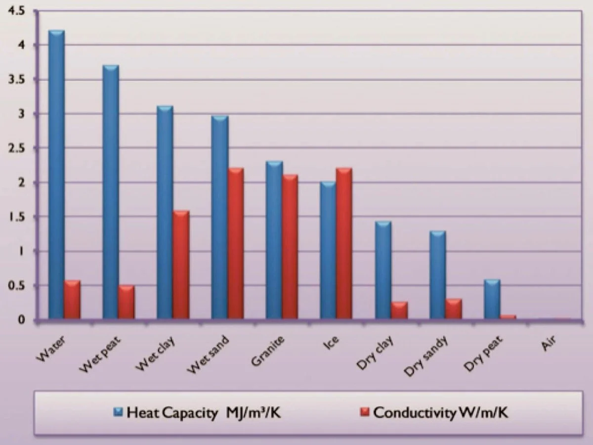 Different heat sources have different thermal properties, as shown in the diagram below taken from the book Heat Pumps for the Home. Under a relatively thin layer of topsoil, ground, for example, may consist of clay, sand, rock or a combination of various things.