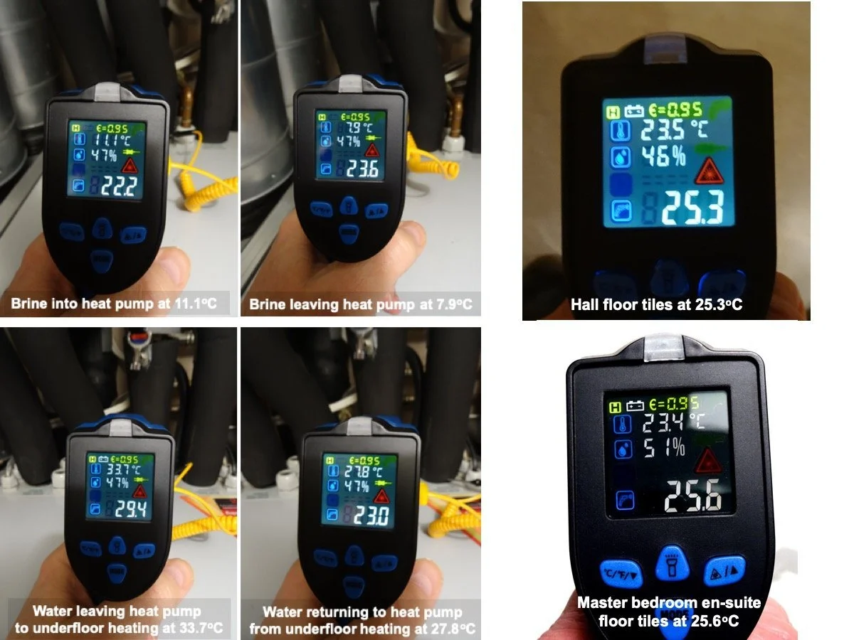 The two pictures below on the right (using an infra-red ‘no touch’ thermometer) show the surface temperatures of the floor tiles in the hall and in the master bedroom en-suite bathroom at 25.3°C and 25.6°C, respectively. (The temperatures are shown in different positions on the screen for the thermocouple and the infra-red readings.)