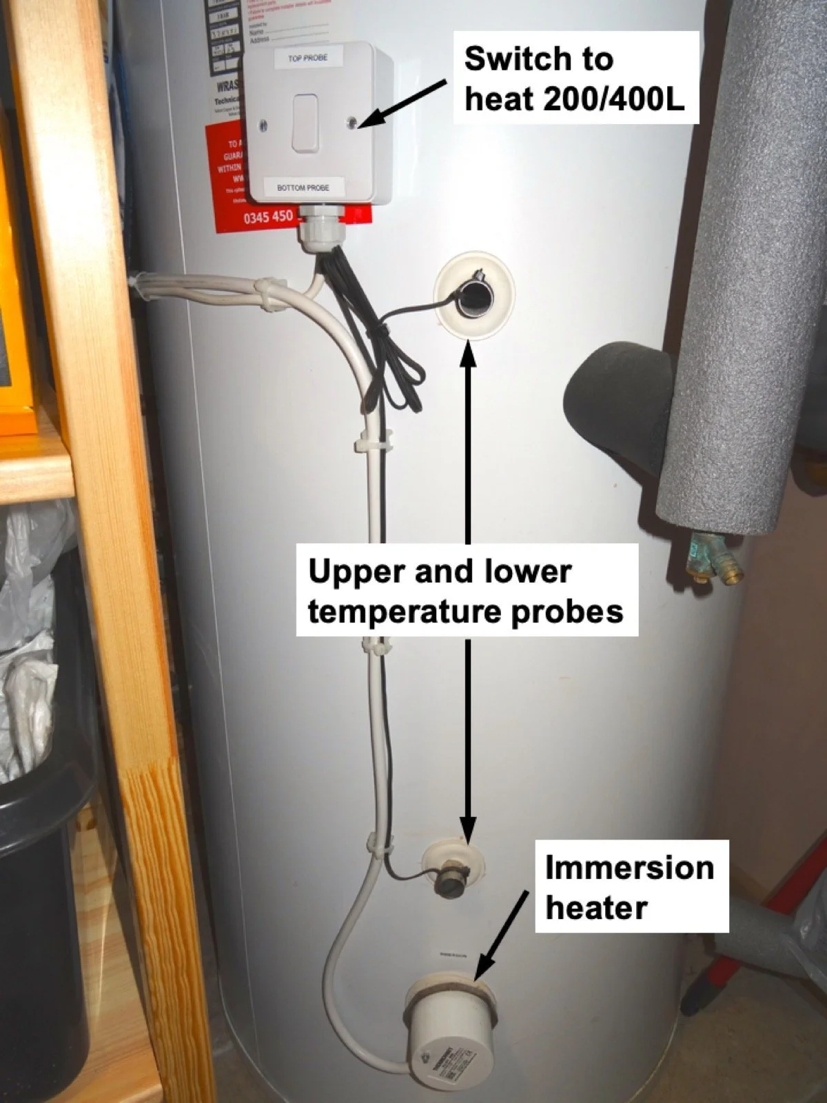 We had a 400L domestic hot water cylinder fitted to ensure a sufficient supply when both guest rooms are occupied. However, to avoid unnecessary water heating we had two temperature probes fitted to this. We can thus switch the heat pump input to heat the top half of the cylinder or the whole cylinder, as required. These are shown in the picture on the left.