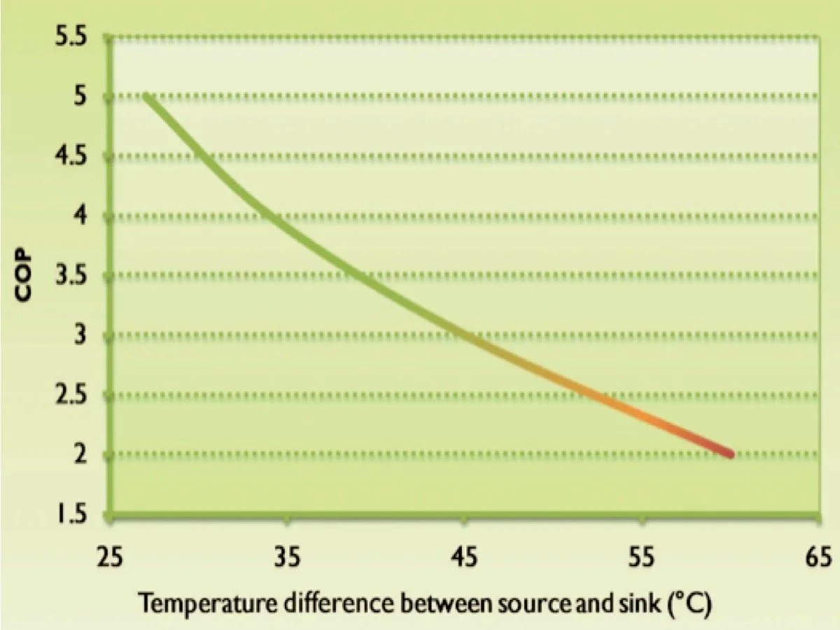 Heat pumps are most efficient when the difference between the heat source temperature and the emitter temperature is small.