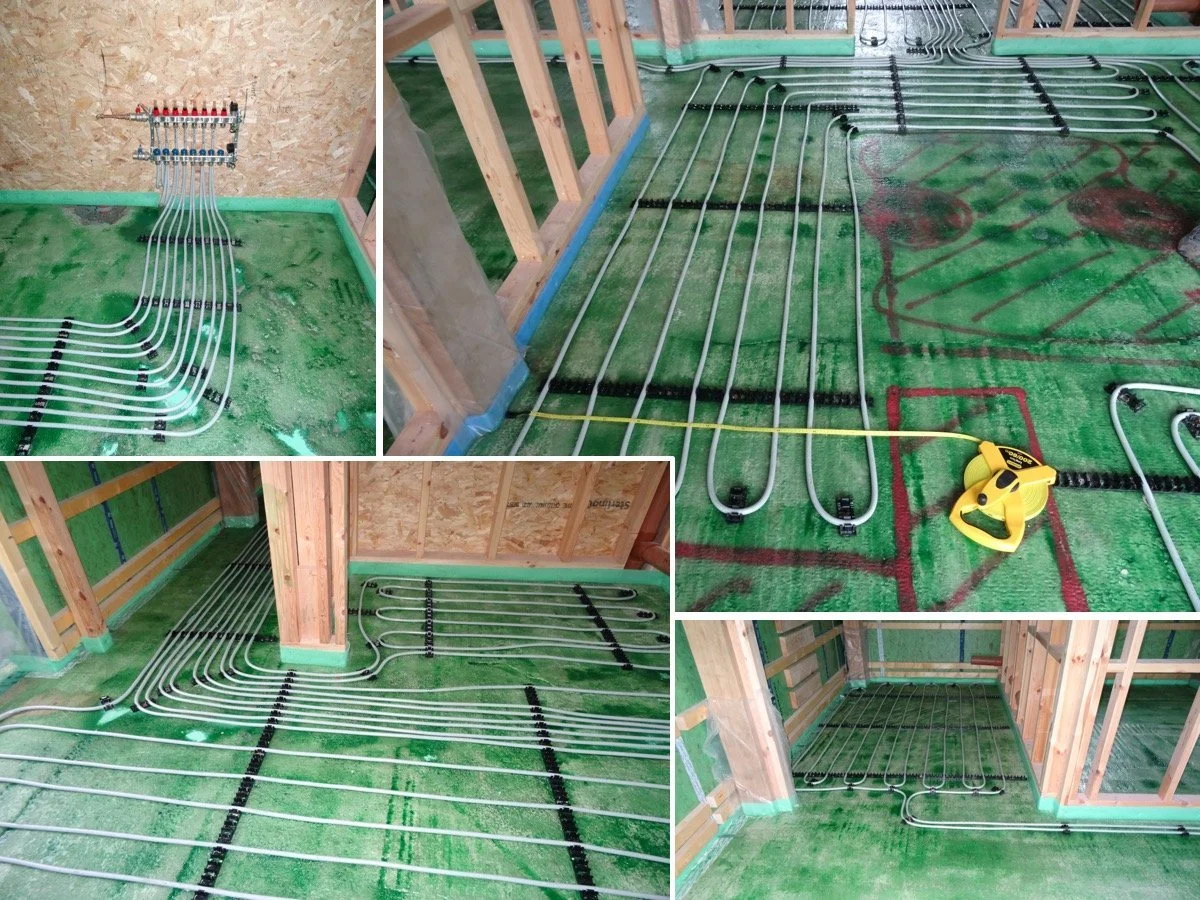 Bottom left is the plant room doorway through which all the underfloor heating pipes pass, opening into the boot room (foreground) and, to the top right of this view, the downstairs toilet area. The bottom right picture shows the underflor heating pipes in one of the guest room en-suite bathrooms.