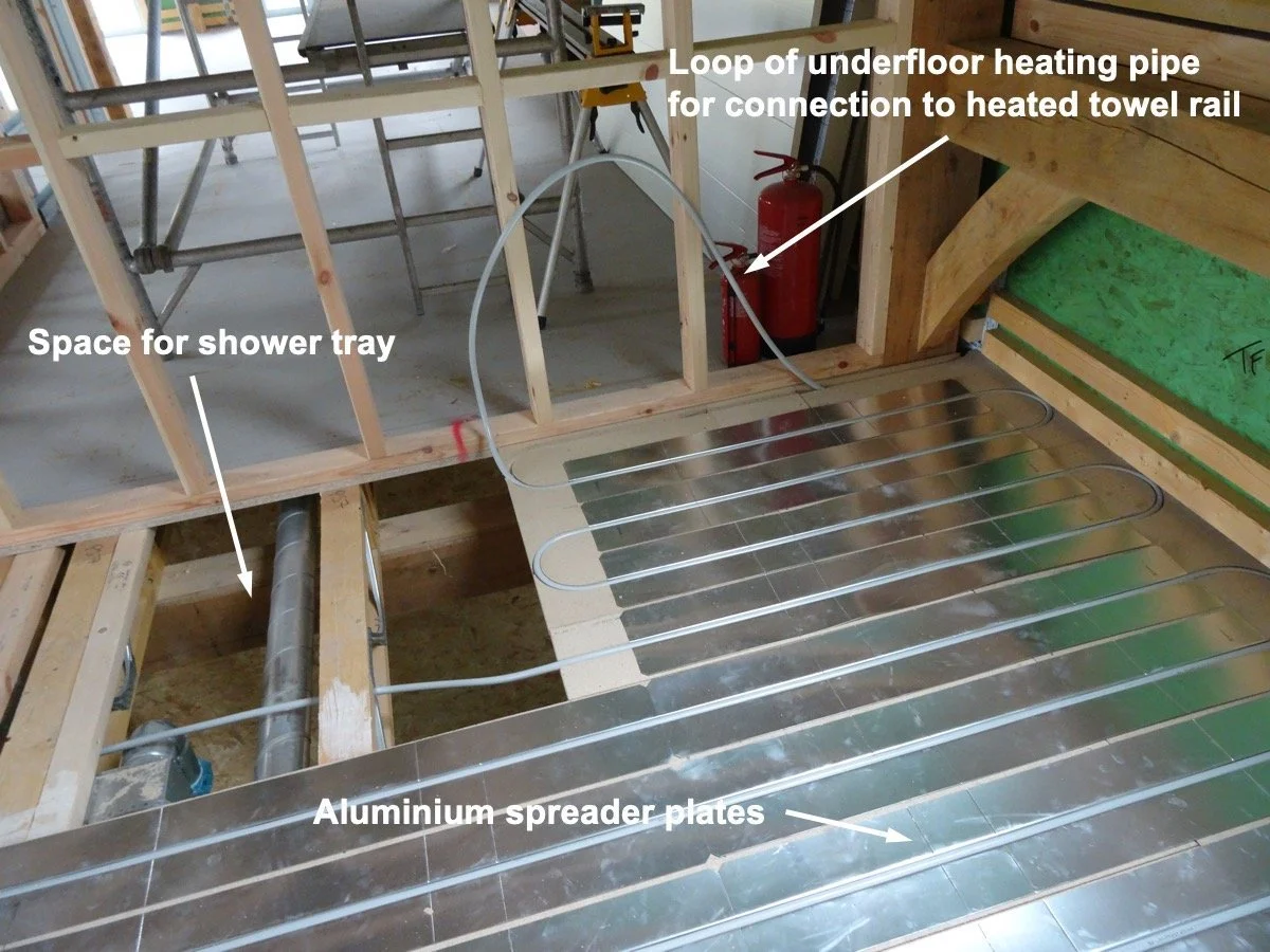 This was not possible for the single heated area upstairs: the master bedroom en-suite bathroom. Here we used special boards with aluminium spreader plates to help dissipate the heat upwards and into the overlying floor tiles.